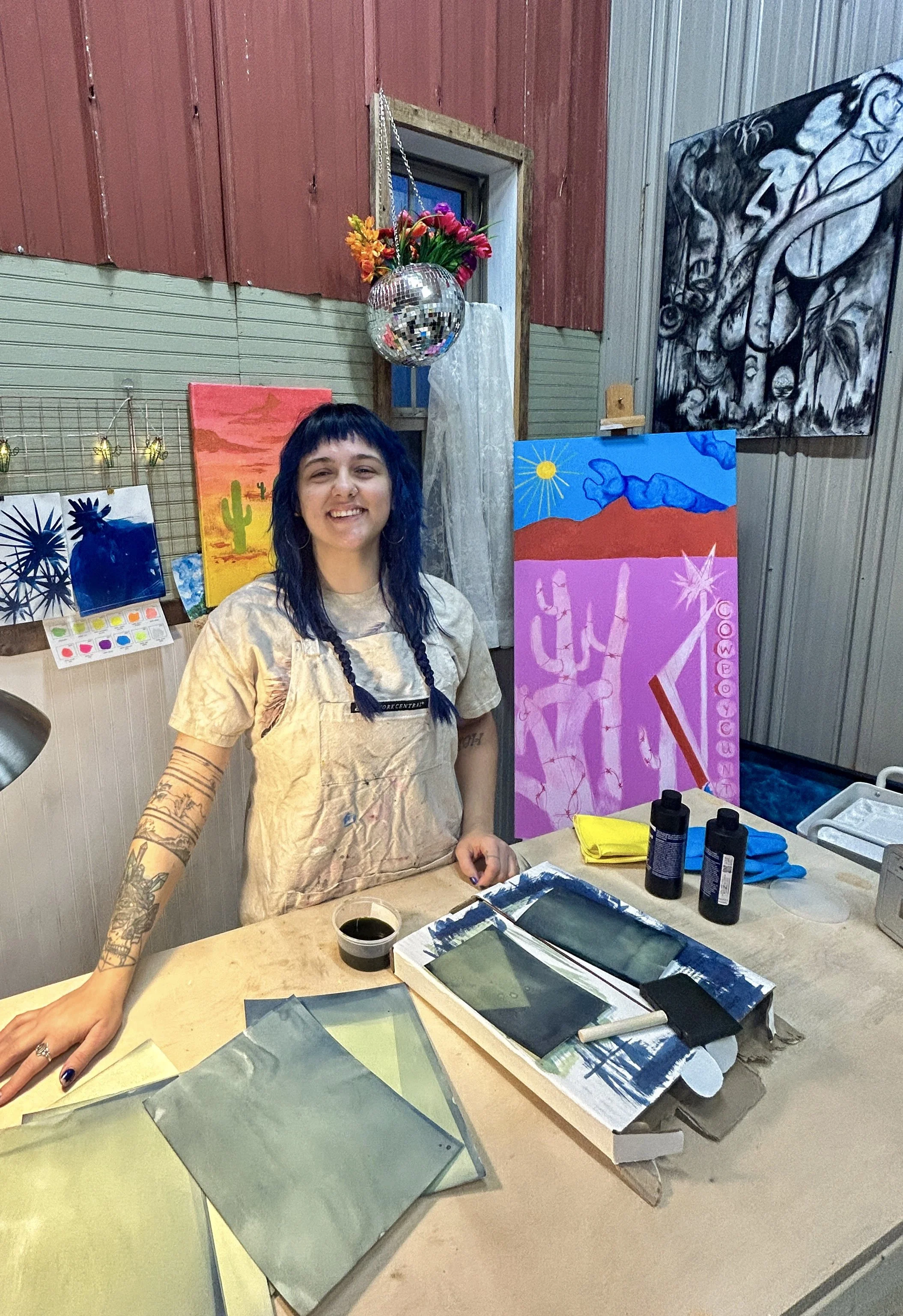 A Tennessee native and new member of the local artistic community. Shelby is a neurodivergent mixed media artist whose work shifts between acrylic, gouache, cyanotype, leather, and other tactile mediums. Her creative process is shaped by the natural world, evolving perceptions of color, and emotional experiences. Stemming from sensory awareness and intuition, her practice is responsive and continually evolving. She is happy to be here and create.
